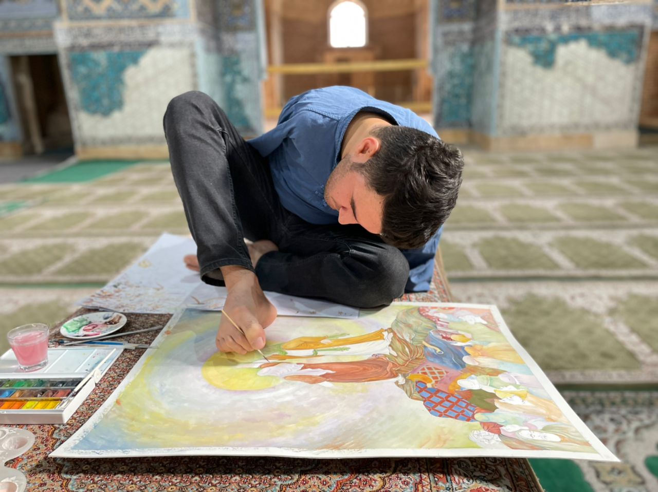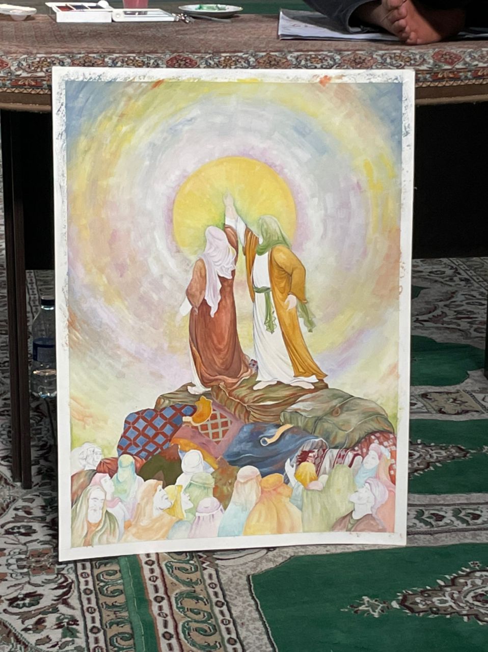 این هنرمند تبریزی ادامه داد: این اثر همان صحنه ای است که پیامبراکرم(ص) دست حضرت علی(ع) را بالا می برد و ایشان را مولای مومنان خطاب می کند.