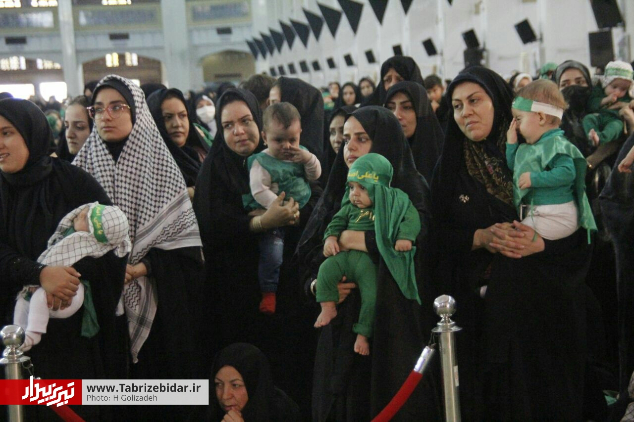 سرویس فرهنگی تبریزبیدار/ مصلی امام خمینی(ره) تبریز امروز شاهد حضور شیرخوارگان سبزپوشی بود که به عشق طفل شیرخوار دشت نینوا، لباس سربازی حضرت را بر تن کرده بودند.