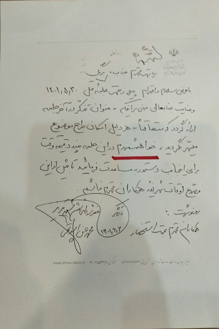 در پایان جلسه امروز شورا، به بررسی نامه شهرداری تبریز در خصوص انتخاب یک نفر از اعضای شورای اسلامی کلانشهر تبریز به عنوان عضو ناظر در سازمان حمل و نقل ریلی شهرداری تبریز پرداخته شد.