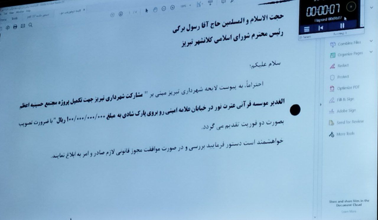 در ادامه دستور جلسه دوم، لایحه مشارکت شهرداری در پروژه مجتمع حسینیه اعظم الغدیر موسسه قرآنی نور به مبلغ ۱۰۰ میلیارد ریال نیز بررسی شد.
