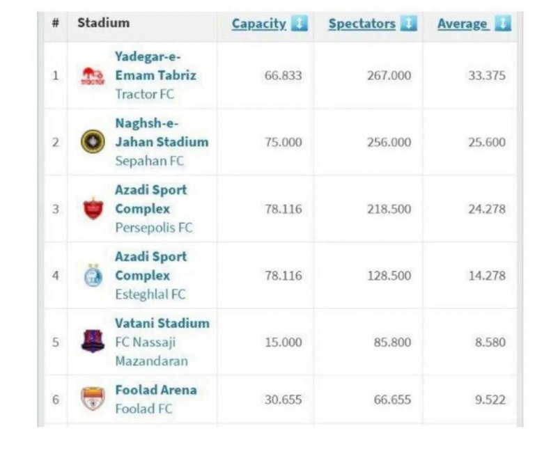سپاهان اصفهان نیز در رده دوم این جدول است. ورزشگاه نقش جهان اصفهان، با پذیرایی از ۲۵۶ هزار تماشاگر سپاهانی در رده دوم قرار گرفته و بعد از این دو تیم نوبت به سرخابی‌های پایتخت رسیده است.