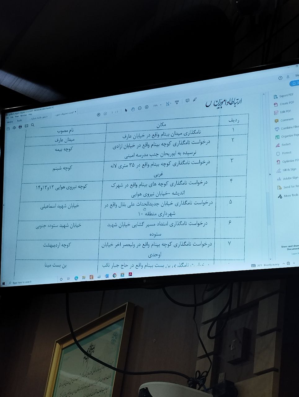 دستور پنجم جلسه امروز شورا به بررسی مصوبات کمیته نامگذاری اماکن و معابر عمومی شهر تبریز پرداخت.