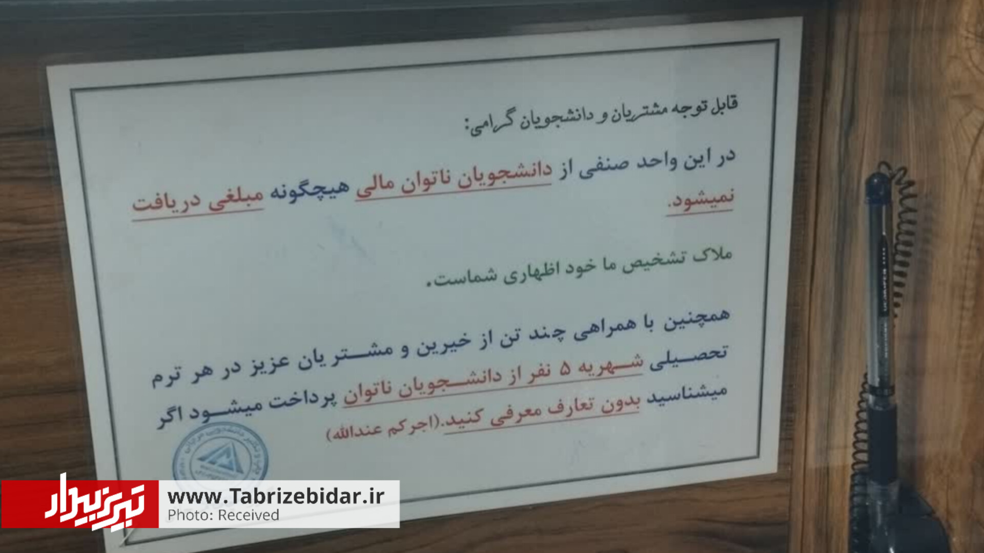 روی برگه نوشته بود:«در این واحد صنفی از دانشجویان ناتوان مالی هیچگونه مبلغی دریافت نمی شود»
