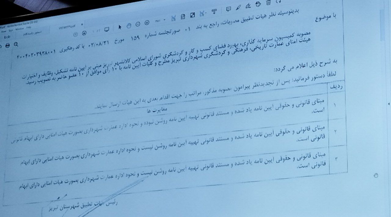 در دستور چهارم جلسه امروز شورا، نامه فرماندار و رییس هیئت تطبیق مصوبات شهرستان تبریز مبنی بر آیین نامه تشکیل، وظایف و اختیارات هیئت امنای عمارت تاریخی، فرهنگی و گردشگری شهرستان تبریز بررسی شد.