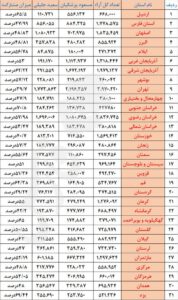 به گزارش تبریز بیدار، براساس آمار غیر رسمی، تعداد آرای اخذ شده توسط دو نامزد انتخاباتی و درصد مشارکت مردم به تفکیک هر استان در جدول درج شده است.