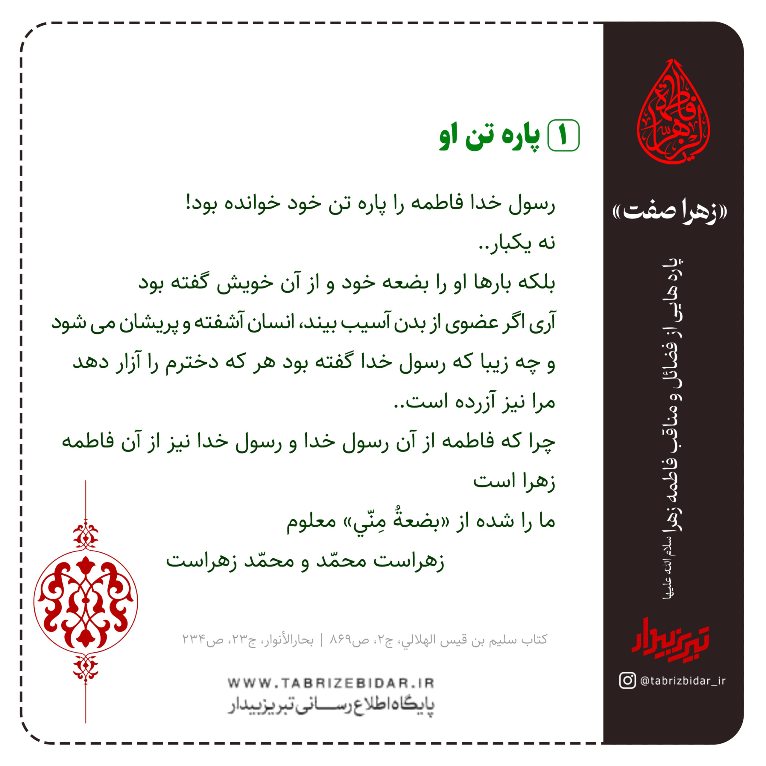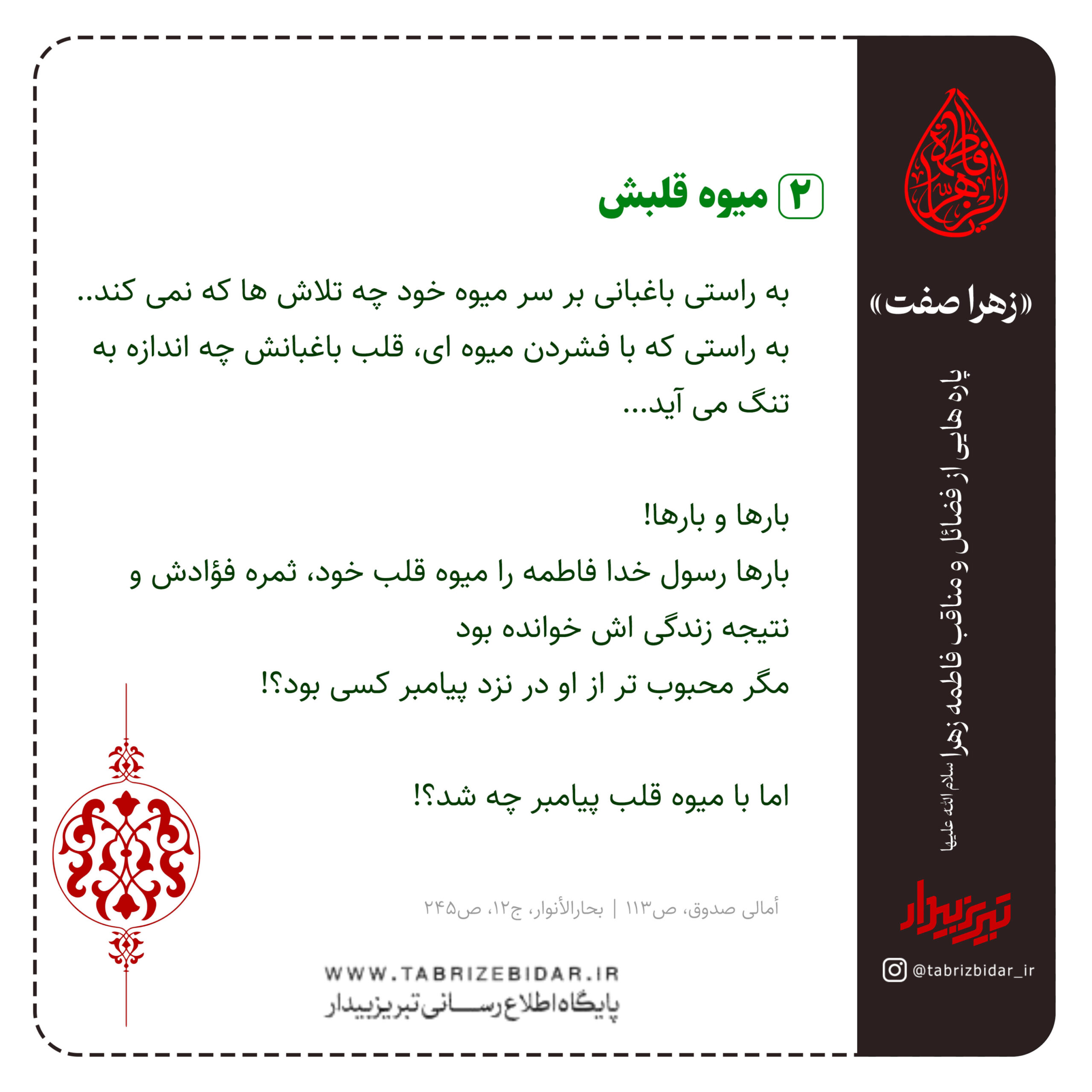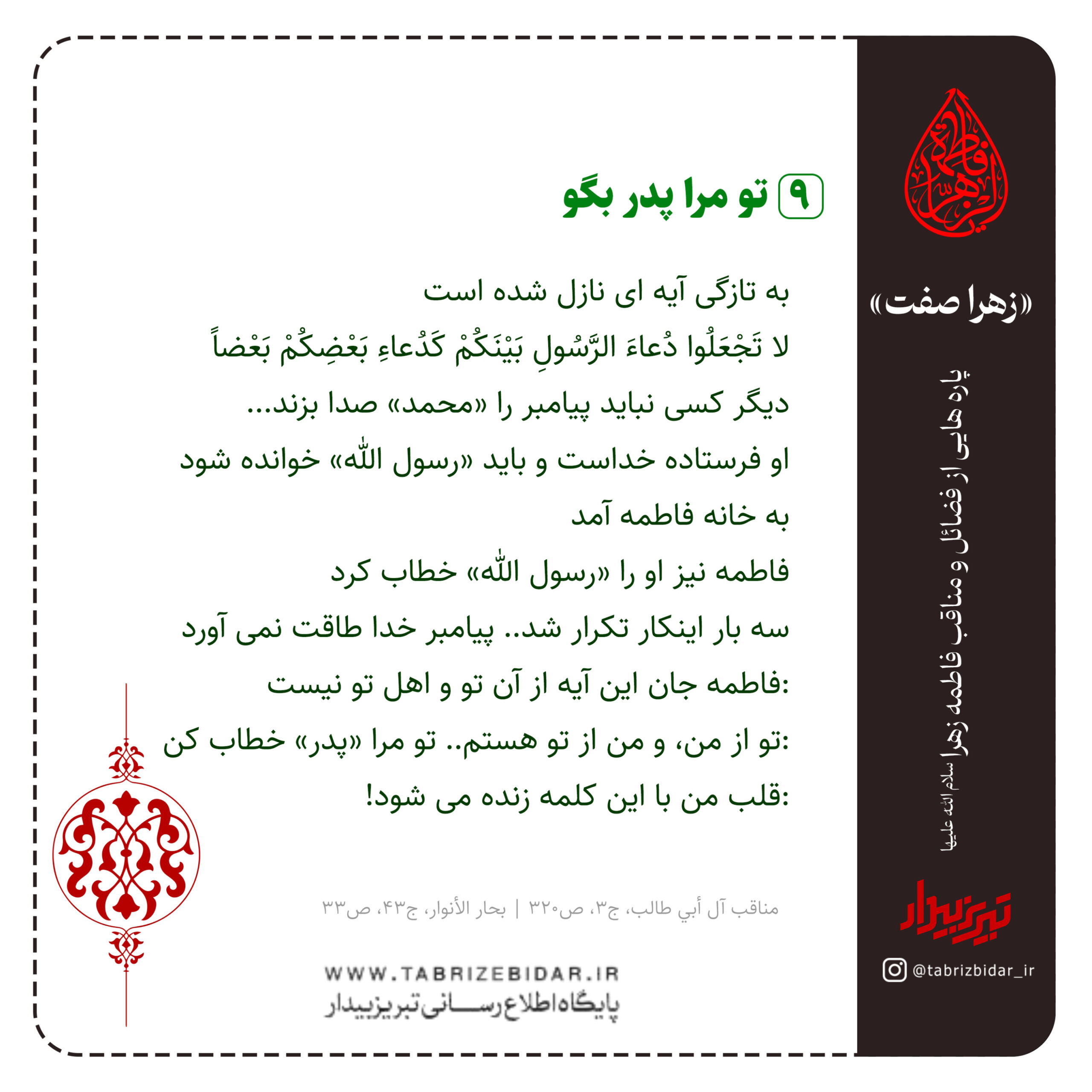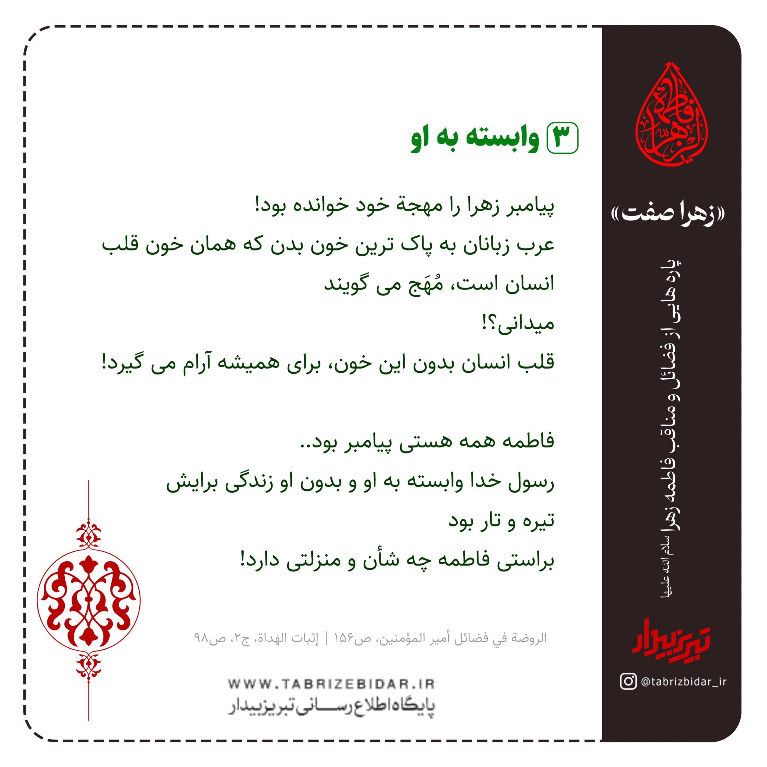 سرویس فرهنگی تبریزبیدار / به مناسبت ایام فاطمیه اول و شهادت حضرت زهرا(س)، مجموعه روایت هایی در قالب پوستر از فضایل و مناقب های این بانوی بزرگ دو عالم با عنوان «زهرا صفت»، تقدیم مخاطبان می شود.