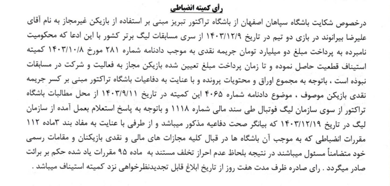 کمیته انضباطی فدراسیون فوتبال رأی خود در پرونده شکایت باشگاه سپاهان از تراکتور و دروازه‌بان این تیم را اعلام کرد.