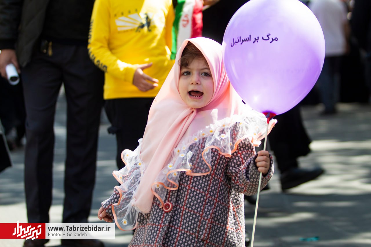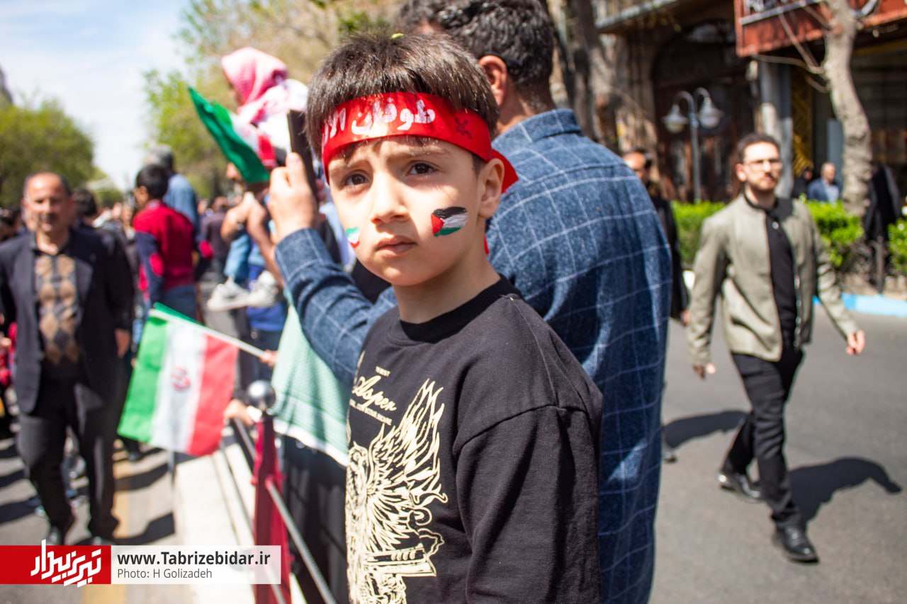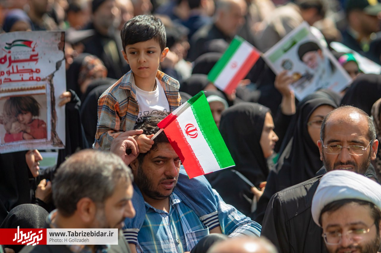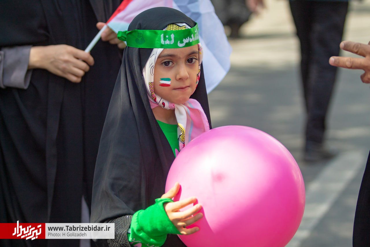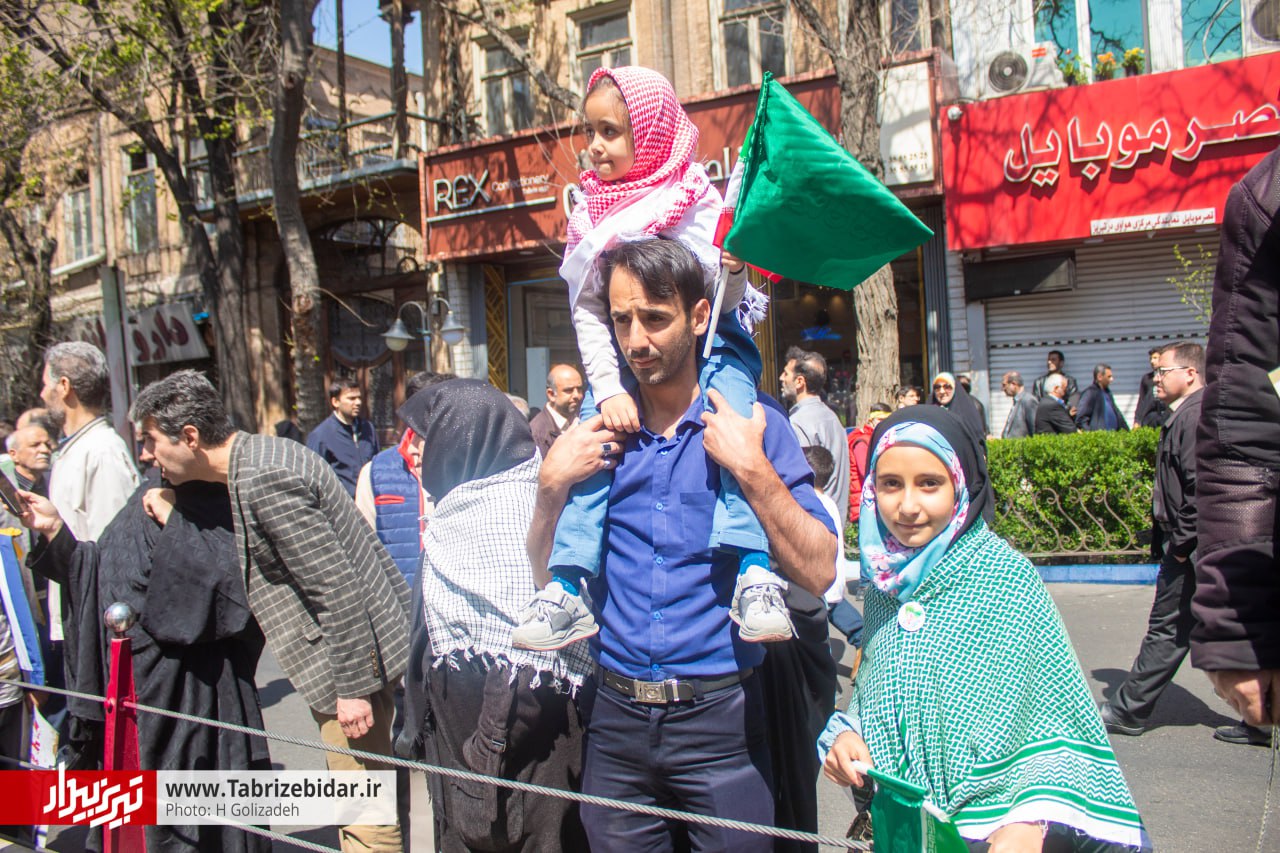 راهپیمایی روز قدس همزمان با سراسر کشور با حضور حماسی مردم تبریز برگزار شد که حضور خانواده ها و کودکان در این تجمع حمایت از غزه و فلسطین، مشهود بود.