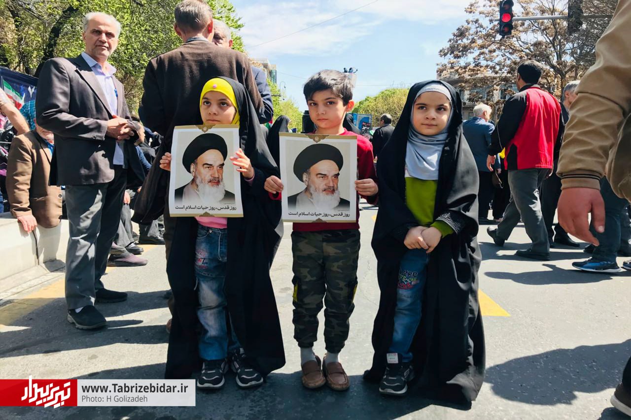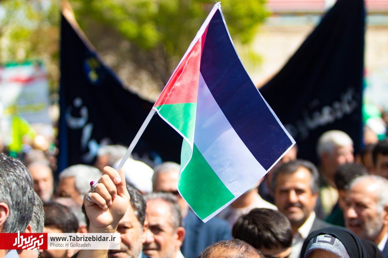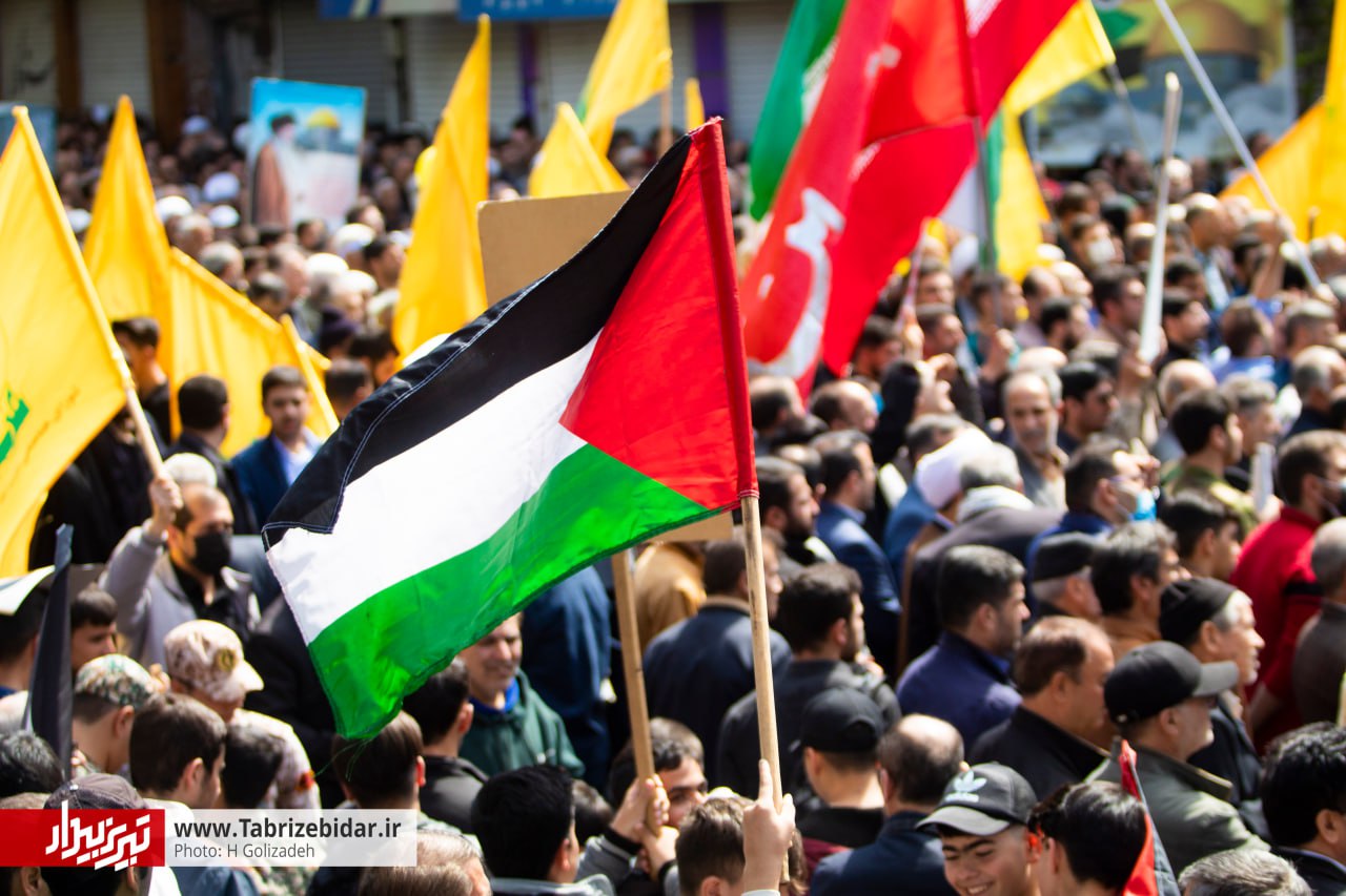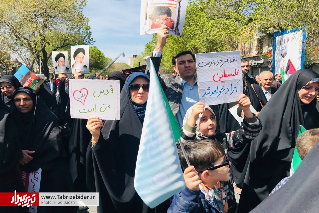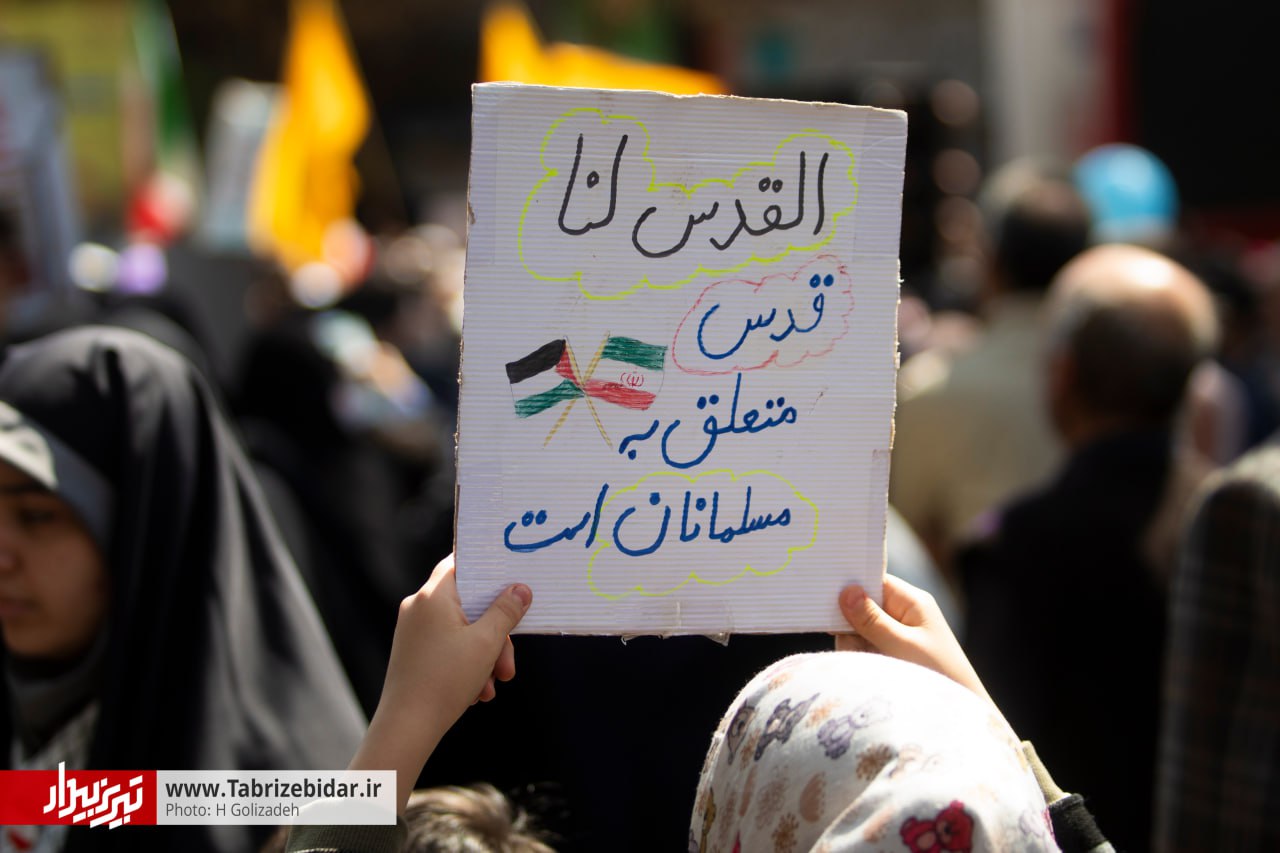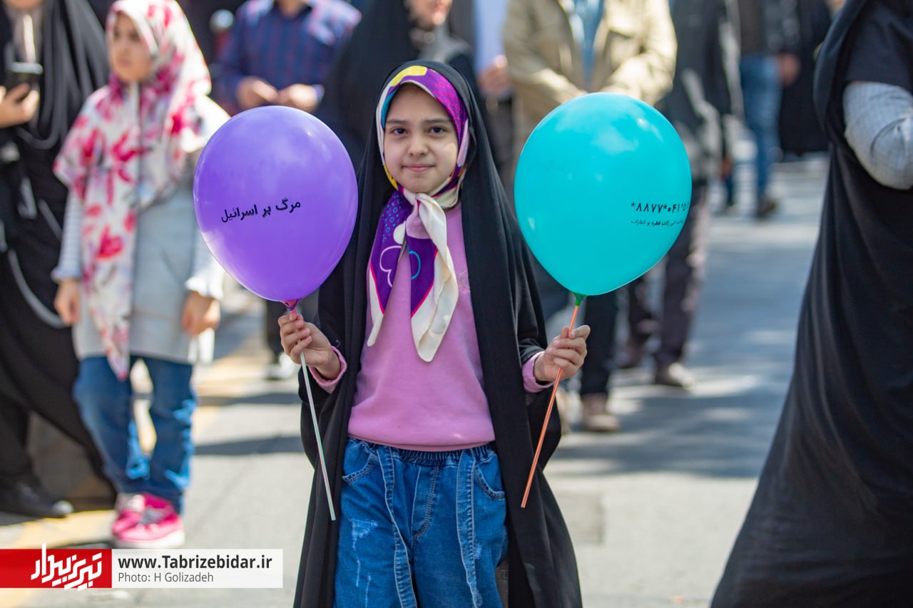 راهپیمایی روز قدس همزمان با سراسر کشور با حضور حماسی مردم تبریز برگزار شد که حضور خانواده ها و کودکان در این تجمع حمایت از غزه و فلسطین، مشهود بود.