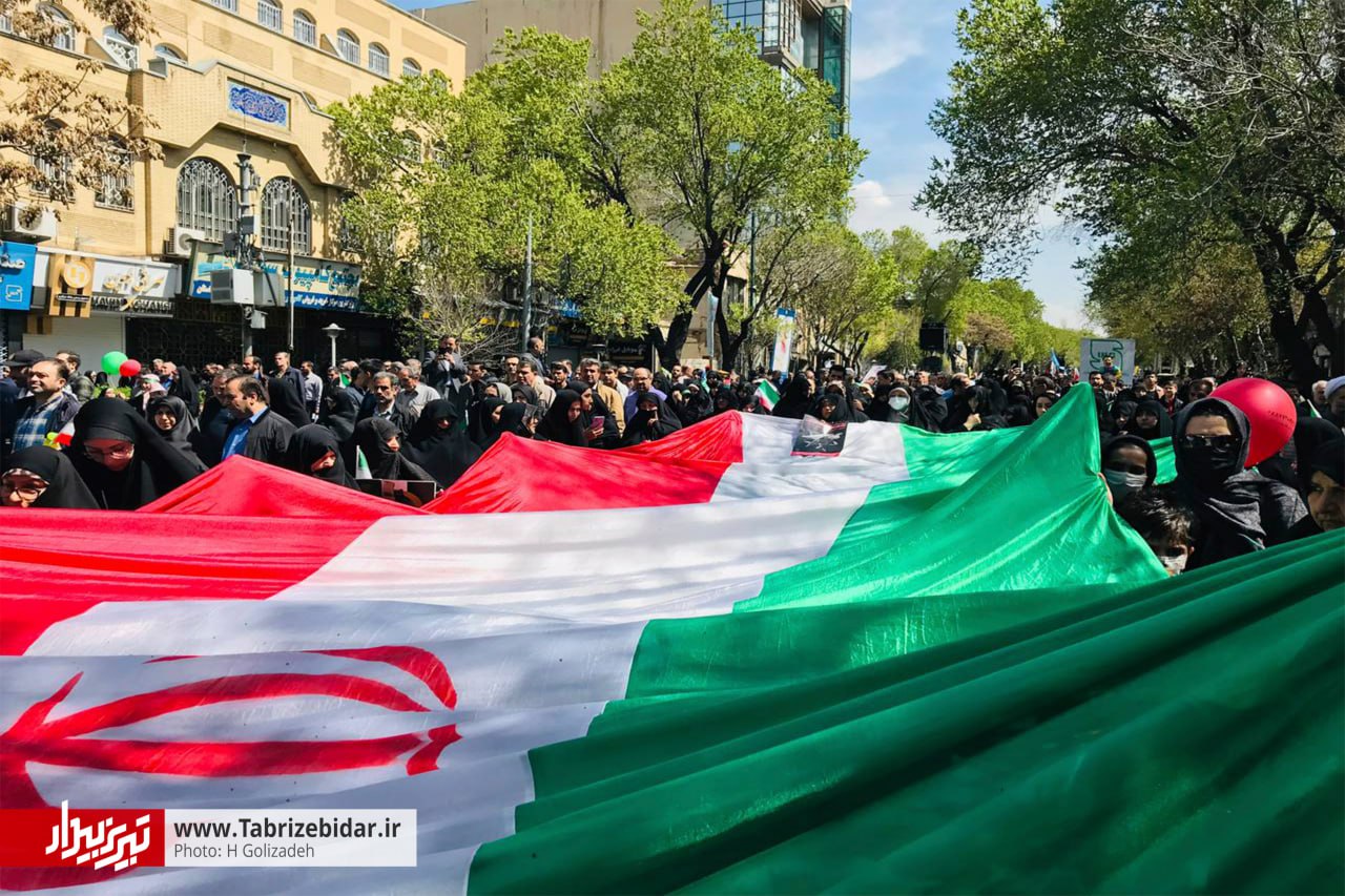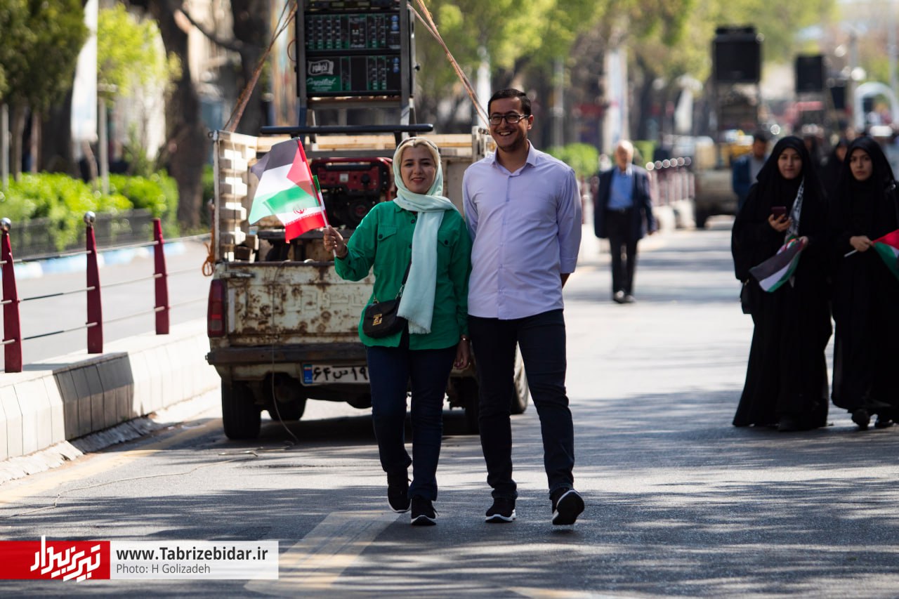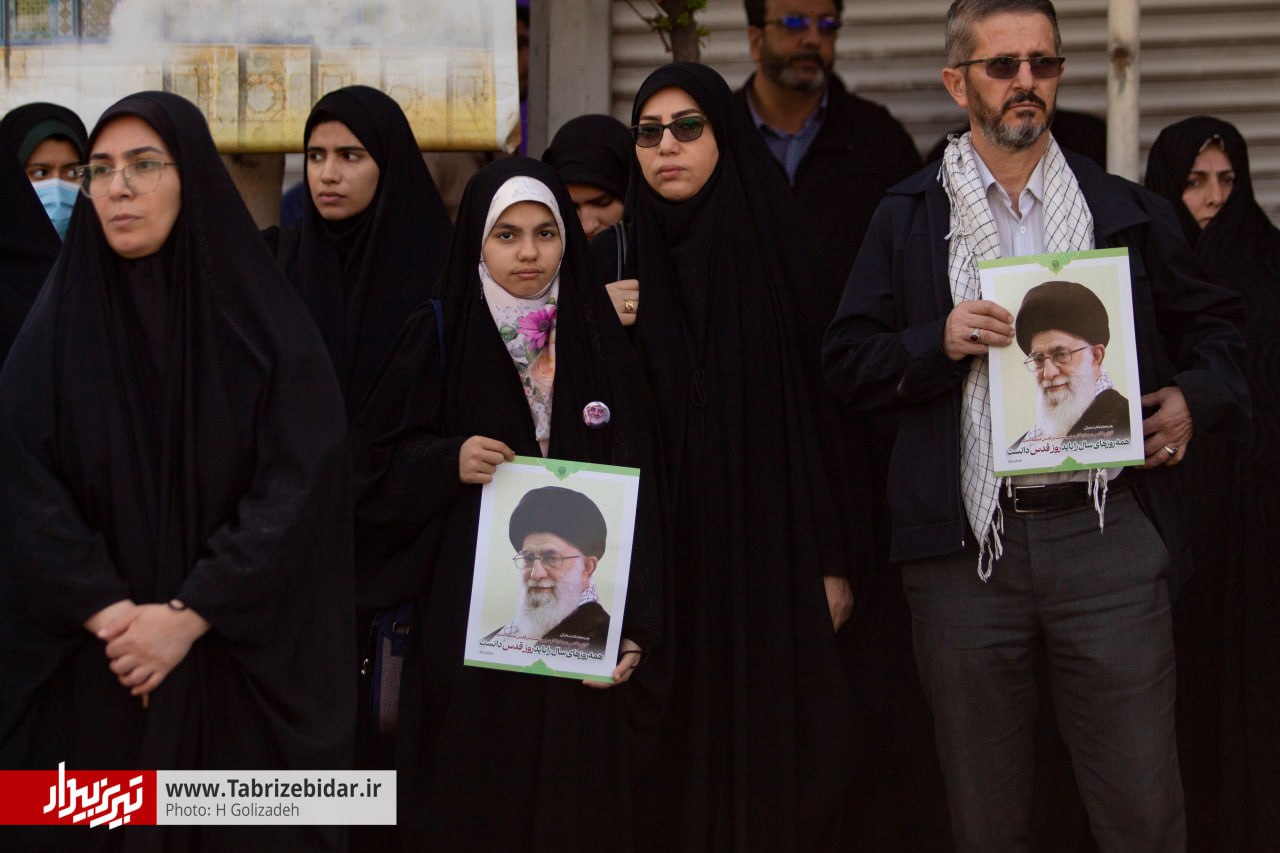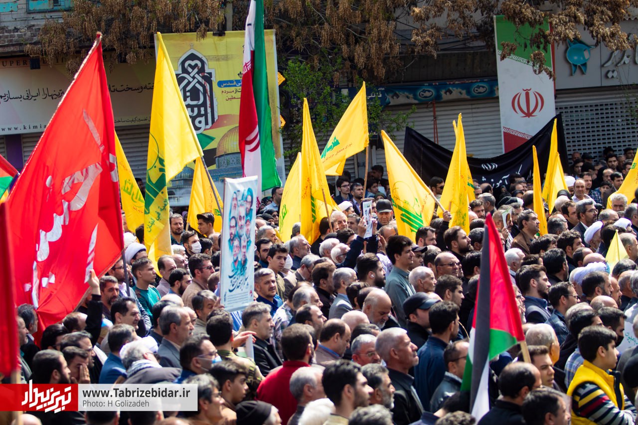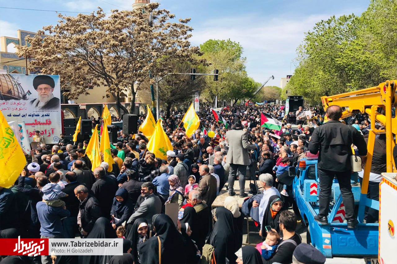 راهپیمایی روز قدس همزمان با سراسر کشور با حضور حماسی مردم تبریز برگزار شد که حضور خانواده ها و کودکان در این تجمع حمایت از غزه و فلسطین، مشهود بود.