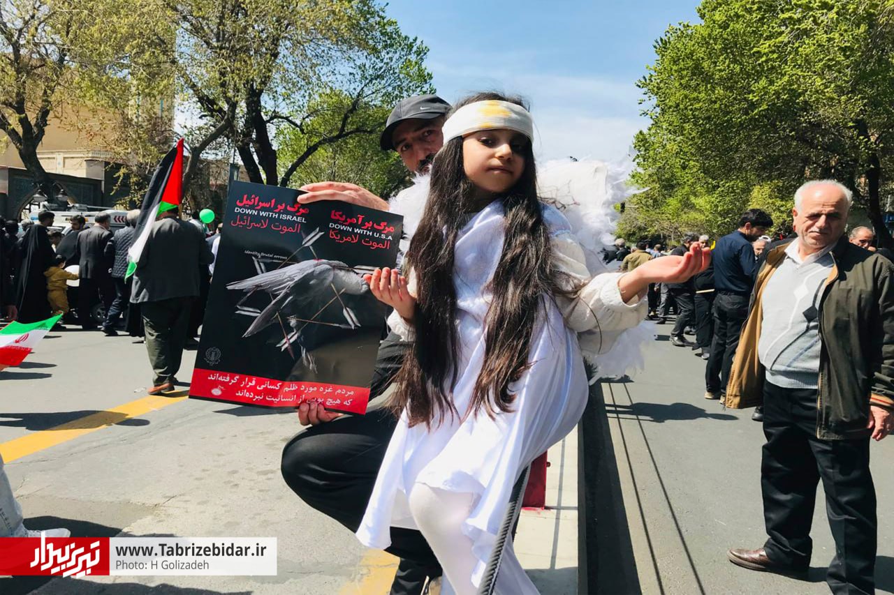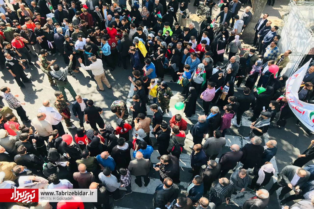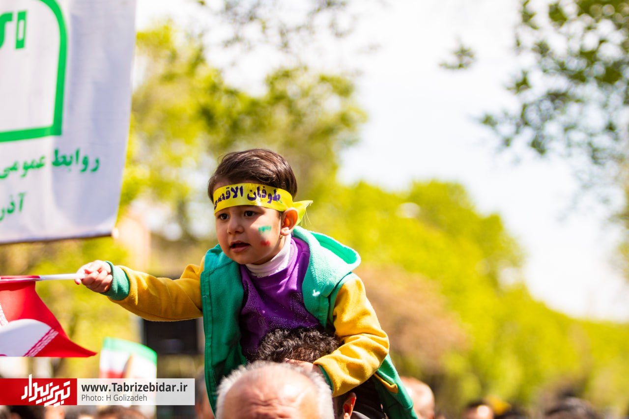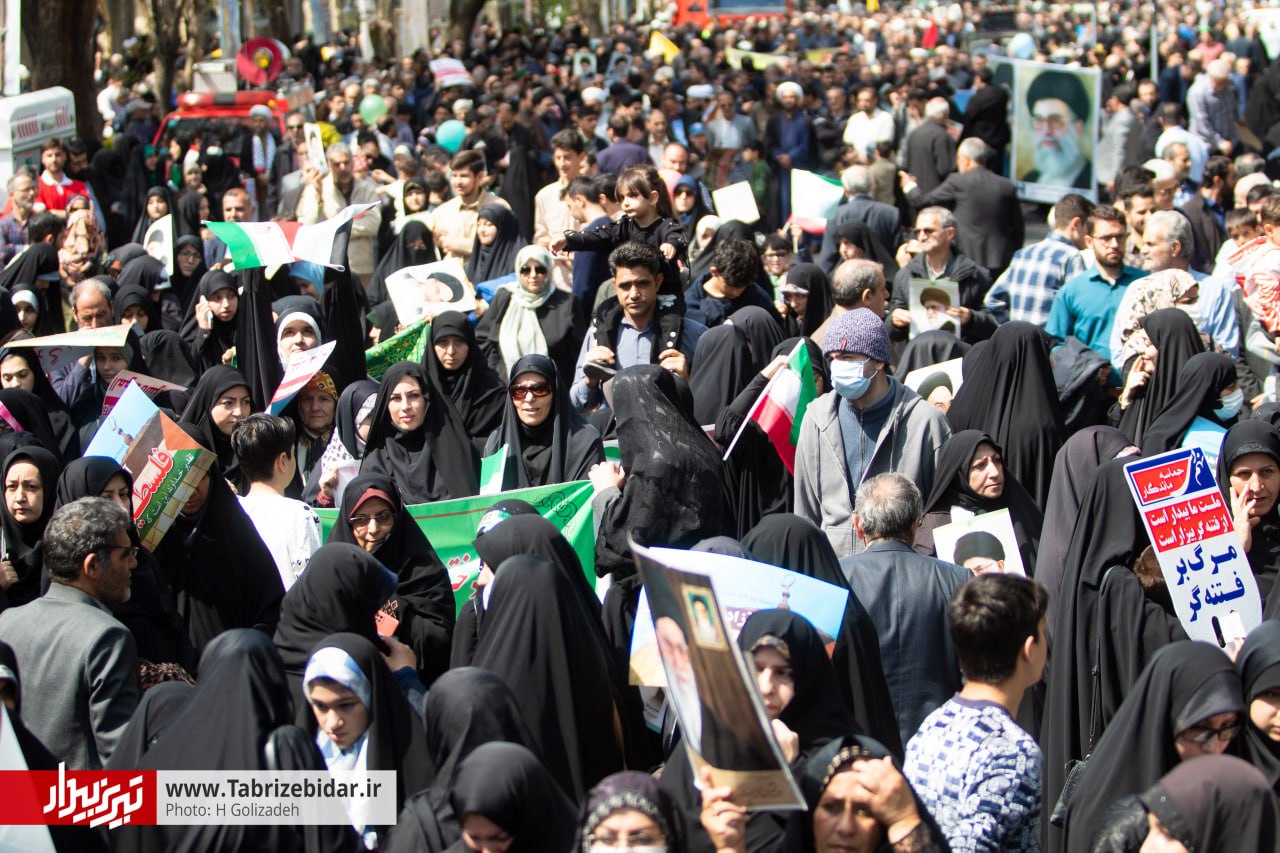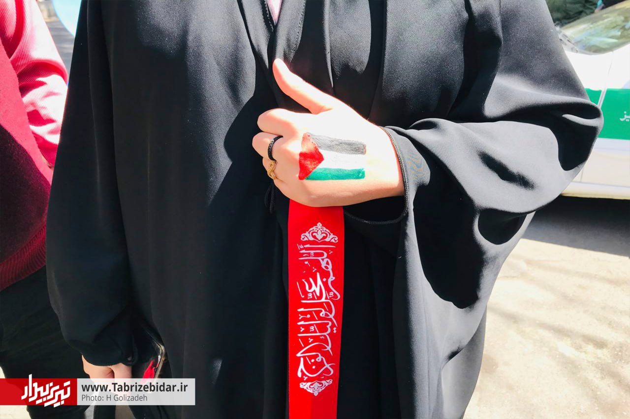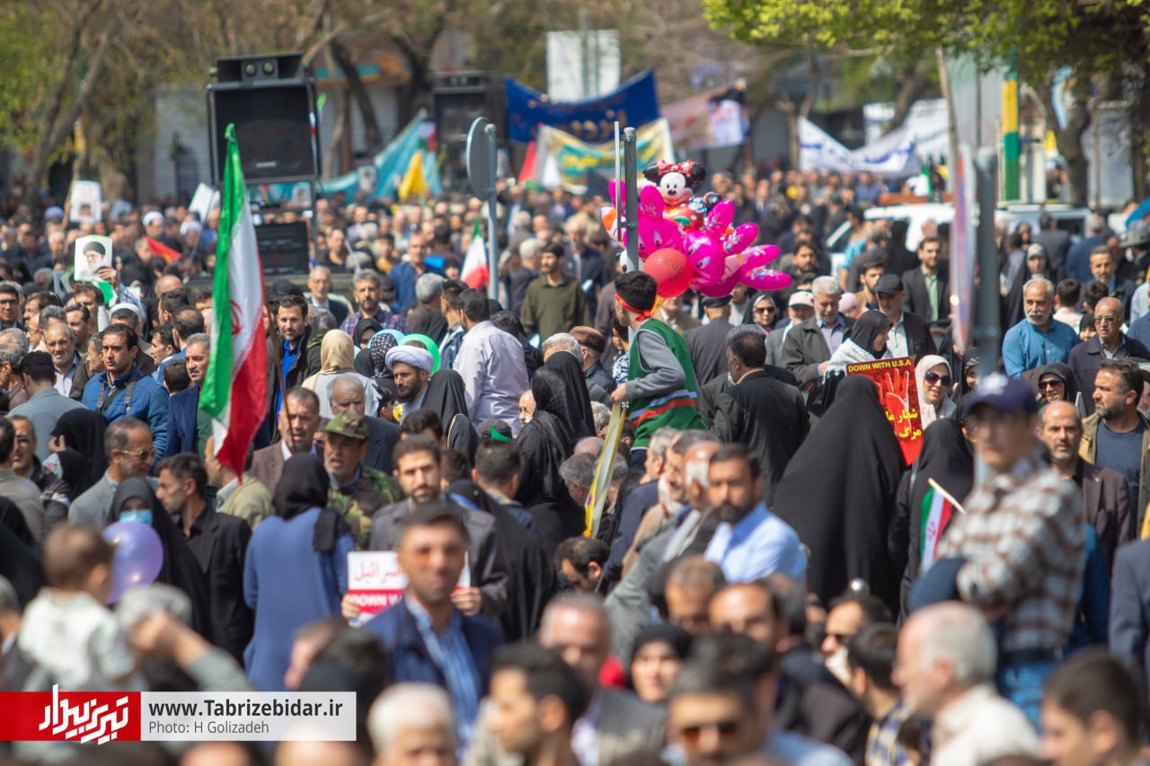 راهپیمایی روز قدس همزمان با سراسر کشور با حضور حماسی مردم تبریز برگزار شد که حضور خانواده ها و کودکان در این تجمع حمایت از غزه و فلسطین، مشهود بود.