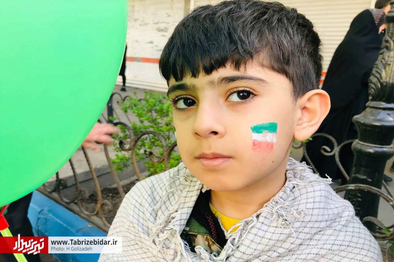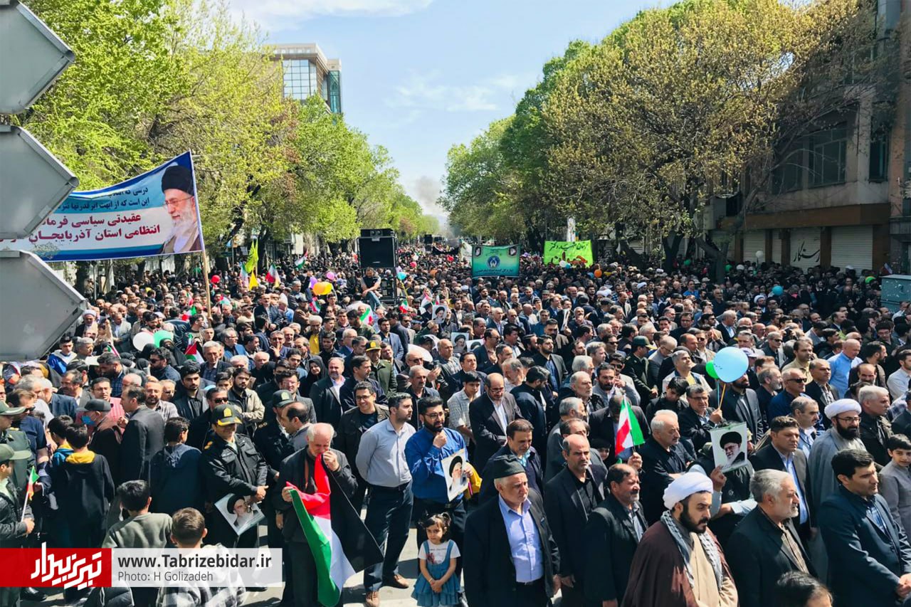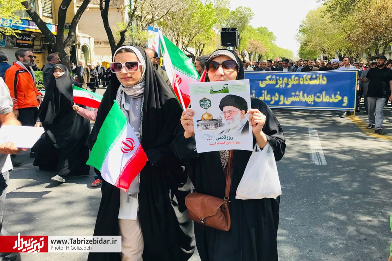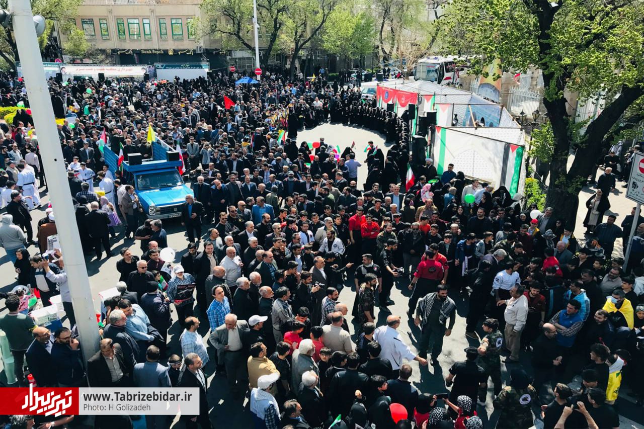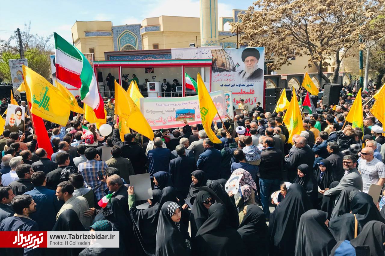 راهپیمایی روز قدس همزمان با سراسر کشور با حضور حماسی مردم تبریز برگزار شد که حضور خانواده ها و کودکان در این تجمع حمایت از غزه و فلسطین، مشهود بود.