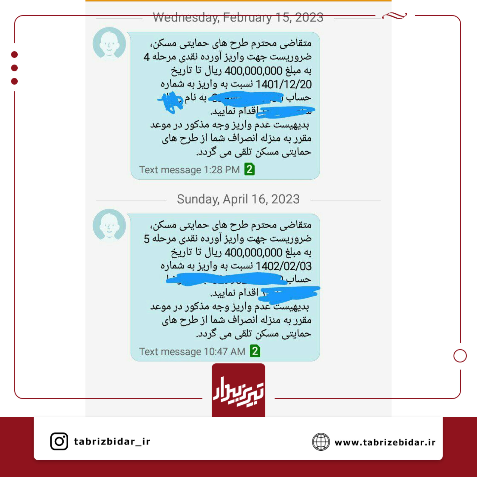 سرویس شهروندی نبریزبیدار/ یکی از شهروندان با ارسال تصویر پیامکی به تبریزبیدار نوشت؛ امروز متقاضیان مسکن ملی شهر جدید سهند پیامکی دریافت کردند که از آنها خواسته شده حداکثر تا یک هفته آینده قسط پنجم مسکن ملی به مبلغ ۴۰ میلیون را واریز نمایند.